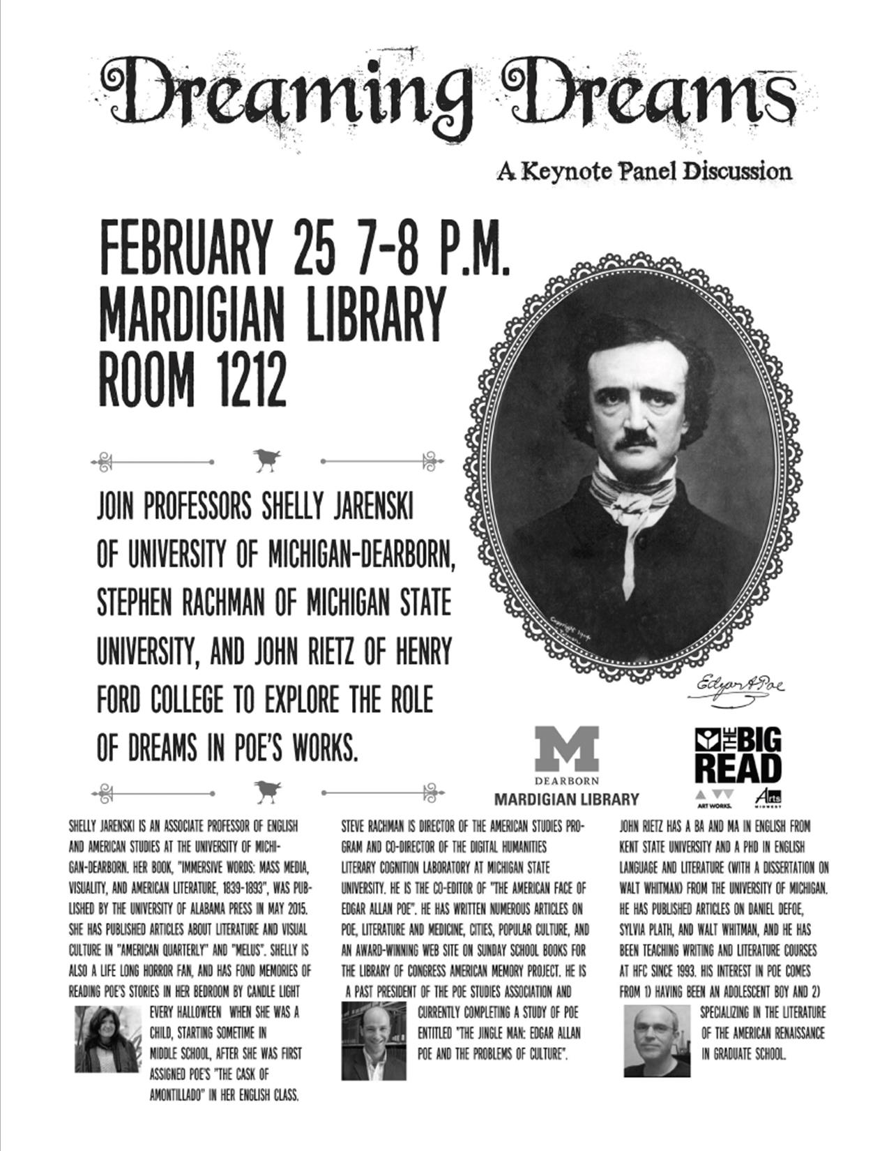Also the Dreaming Dreams Keynote Lecture is happening in Mardigian Library at the University of Michigan-Dearborn on Thursday, February 25, 7-8 p.m. Here’s the flyer. Hope you can attend!