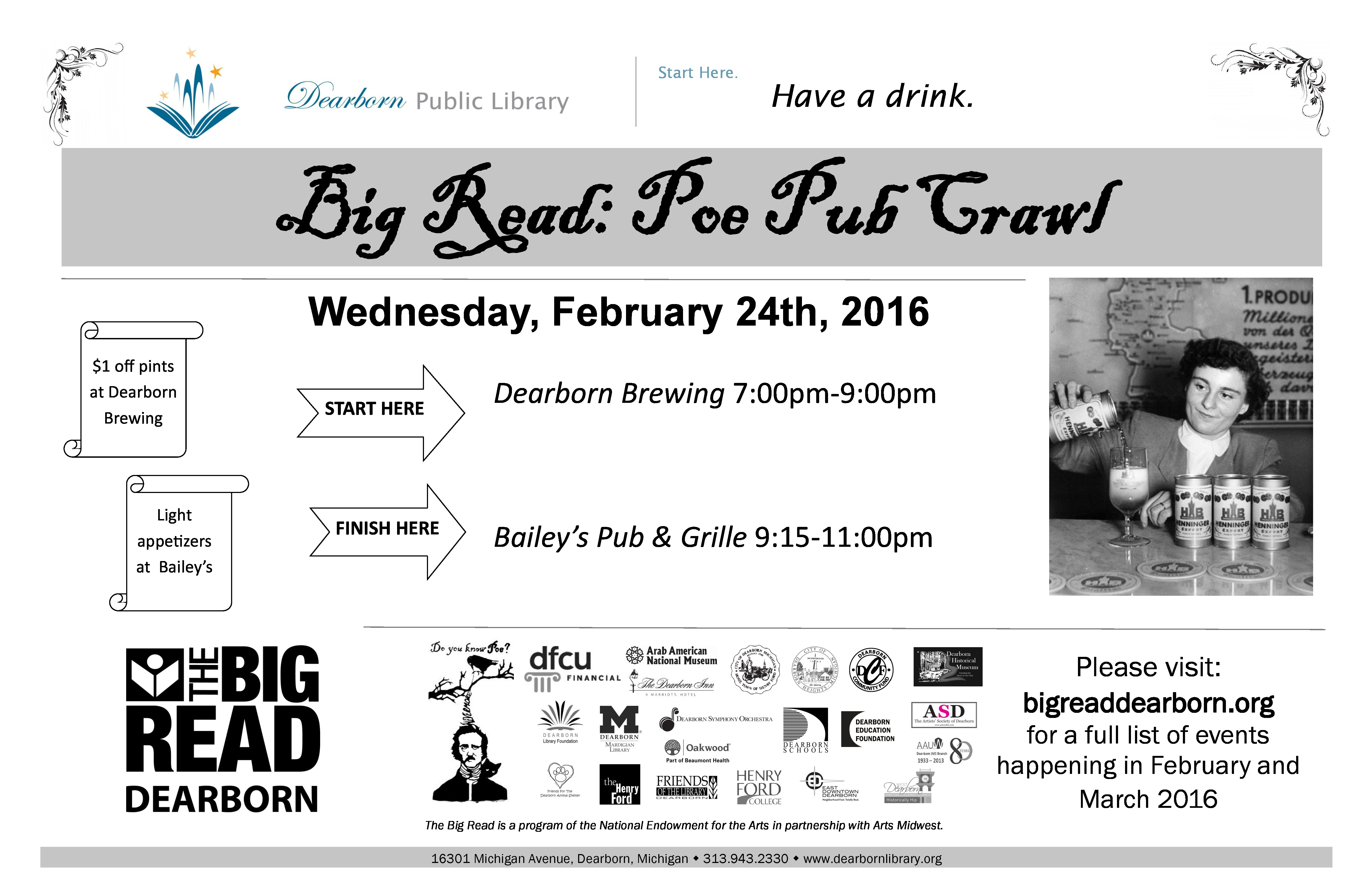 Just a reminder: the Poe Pub Crawl is tonight starting at Dearborn Brewing (7-9 p.m.) and then heading to Bailey’s (9:15-11 p.m.). Check out the flyer here.