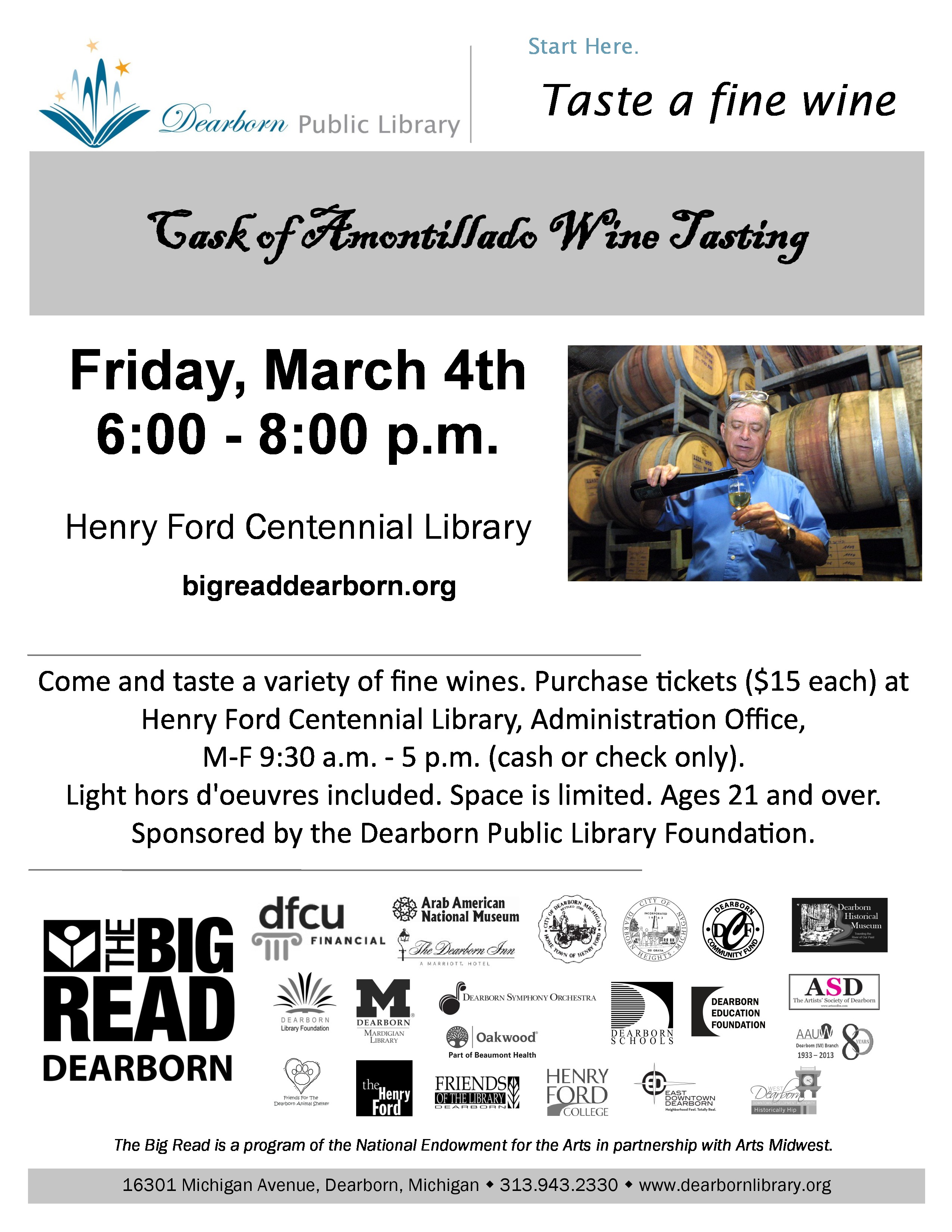 Come and taste a variety of fine wines. Purchase tickets ($15 each) at the Henry Ford Centennial Library administration office. Light hors d’oeuvres included. Space is limited. Ages 21 and over. Sponsored by the Dearborn Public Library Foundation. Here’s the flyer.