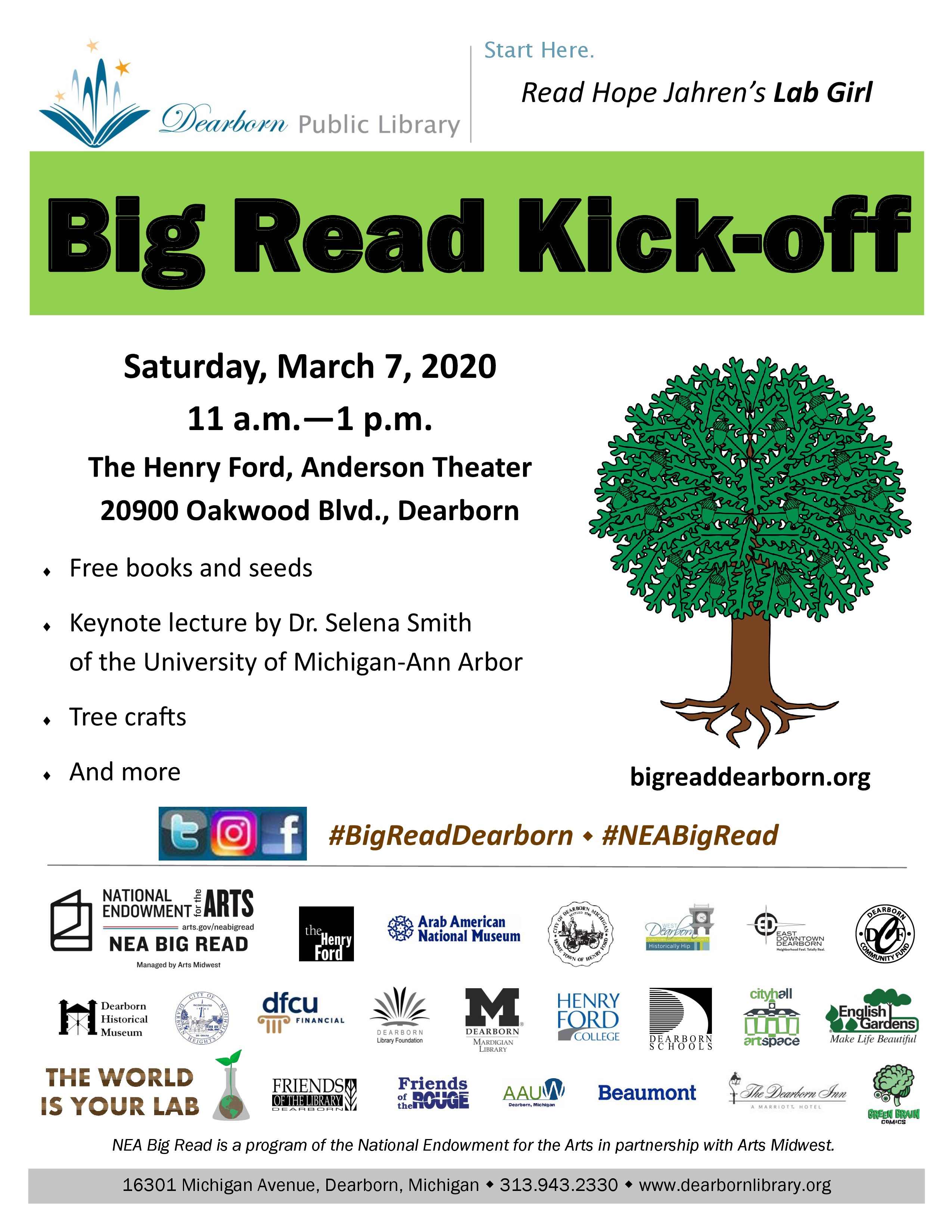 The public is invited to the free kick-off of the Dearborn Public Library’s Big Read, a two-month celebration of the memoir Lab Girl, with activities centered on science and other associated themes.