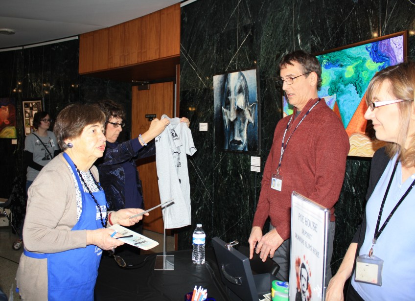 Library staff members Jim Knapp and Nicki Goran with FOLD member Carolyn Cicero at T-shirt and Poe House draw slips Table Published February 26, 2016 at 3573 × 2592 in Kickoff Share this: Click to email a link to a friend (Opens in new window) Email Click to share on Facebook (Opens in new window) Facebook Click to share on X (Opens in new window) X More Click to share on LinkedIn (Opens in new window) LinkedIn Click to share on Pinterest (Opens in new window) Pinterest Click to share on Pocket (Opens in new window) Pocket Click to share on Reddit (Opens in new window) Reddit Click to share on Tumblr (Opens in new window) Tumblr Like Loading...